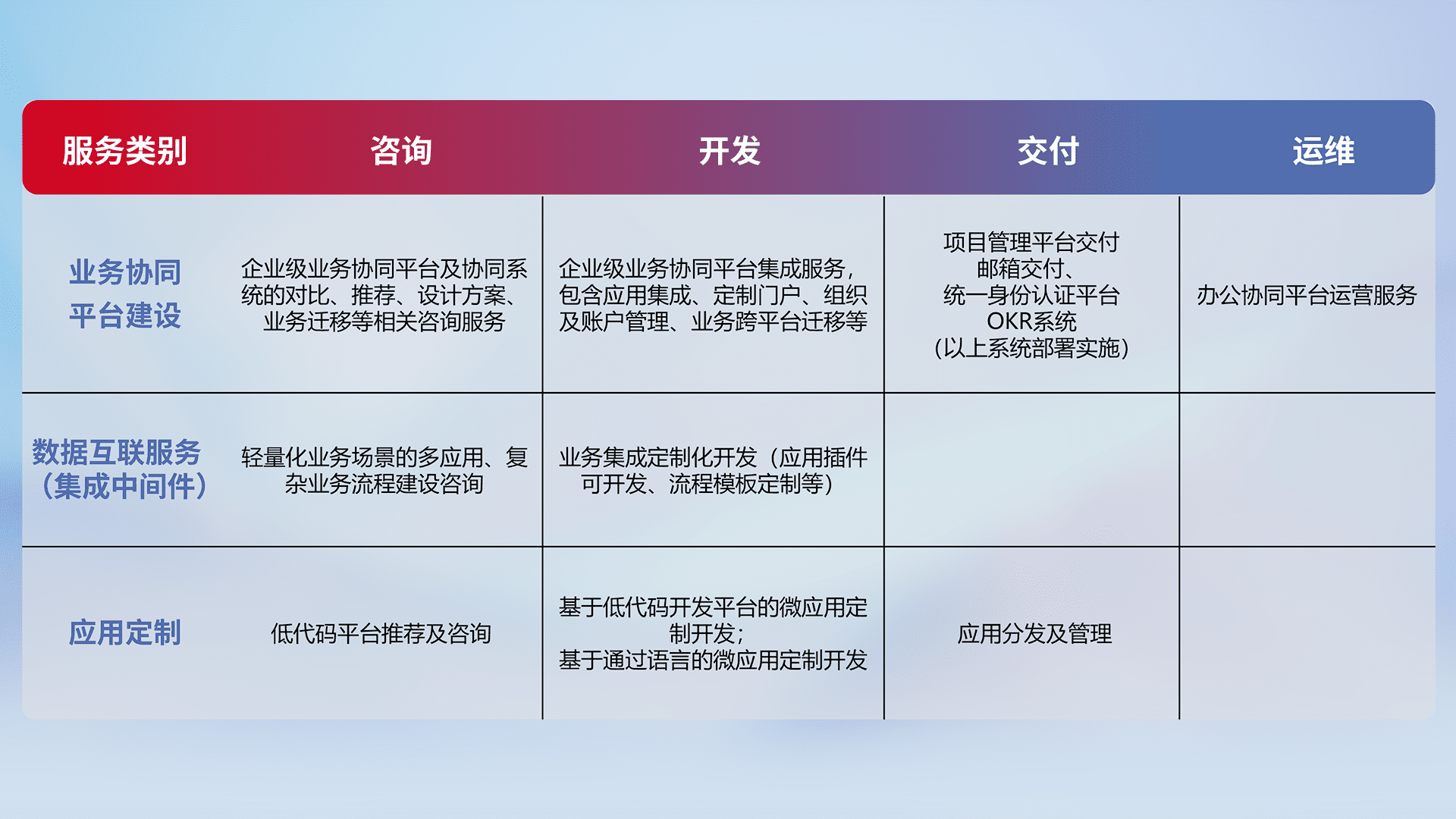 针对钉钉、、、企微、、、IDaas等平台级产品提供产品的规划、、、、方案、、交付、、定制化开发等服务,,实现如统一协同办公、、、智能客户服务、、、混合会议管理、、智能数据查询、、等业务场景,,,实现数字化转型。。